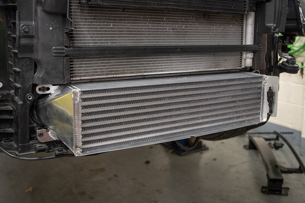 In the development stages, the engineers used their knowledge and sheet metal expertise to help improve vital airflow through the bar and plate core by hand forming alloy sheet metal and the necessary brackets to mount the 83% larger volume intercooler in the OE position. This is the ideal location with a frontal surface area increase of over 27%, and has no detriment to any other of the vehicles cooling components. The development team also created a hand fabricated ducting system that has been skilfully integrated into this superior design, to ensure as much air as possible passes through the face of the intercooler.